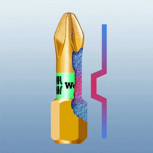 Dzięki opracowanej przez firmę Wera technologii produkcji groty i końcówki z powłoką diamentową umożliwiają pewne osadzenie w gnieździe wkrętu, wyznaczając standardy w zakresie żywotności i funkcjonalności.