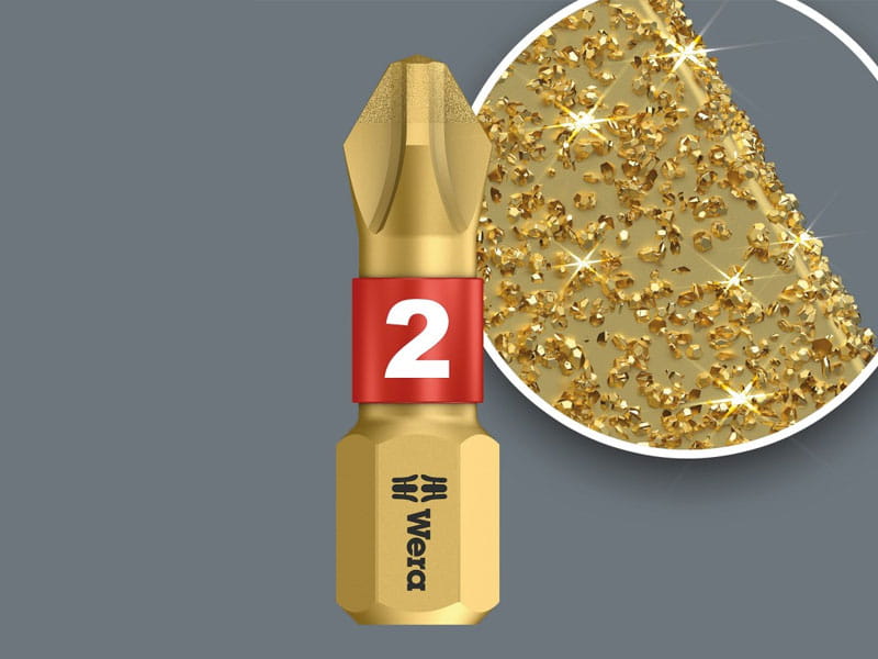 Dzięki opracowanej przez firmę Wera technologii produkcji groty i końcówki z powłoką diamentową umożliwiają pewne osadzenie w gnieździe wkrętu, wyznaczając standardy w zakresie żywotności i funkcjonalności.