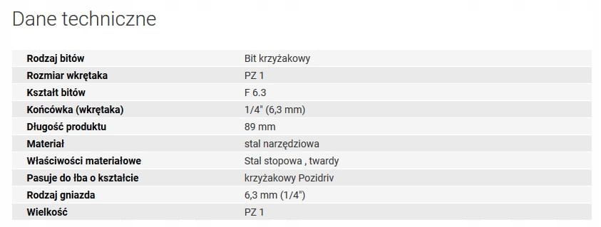 Bit długi do śrub krzyżowych z gniazdem PZ1, o długości 89mm.