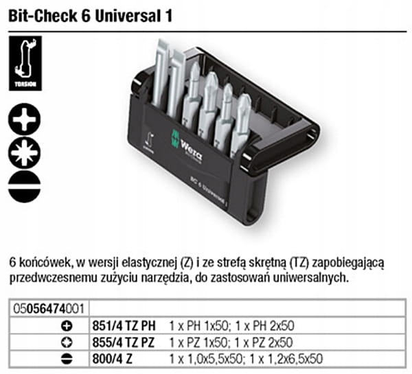 Bity końcówki 6szt. Bit-Check 6 Universal 1 zestaw komplet 056474 Wera