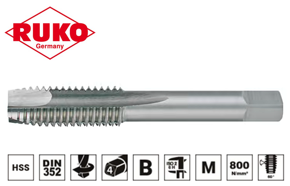 Gwintownik maszynowy do nacinania gwintu HSS do gwintów przelotowych w stalach zwykłych i niskostopowych o wytrzymałości do 800 N/mm2.