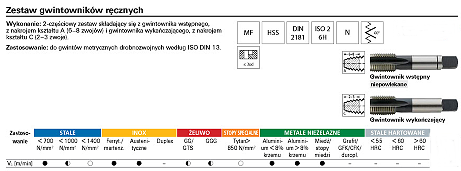 Zestaw gwintowników ręcznych zwykłych wykonanych zgodnie z normą DIN13 z gwintem metrycznym drobnozwojnym charakteryzujących się uniwersalnym zastosowaniem - przeznaczonych do otworów przelotowych i nieprzelotowych.