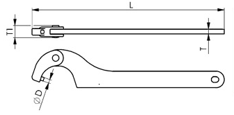 Przegubowy klucz hakowy z czopem, wersja przemysłowa do nakrętek krzyżowo - otworowych DIN 1816.