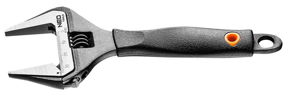 Klucz nastawny NEO o długości 200 mm, odkuwany z wytrzymałej stali chromowo-wanadowej. Wyróżnia się bardzo szerokim zakresem regulacji szczęk do 39 mm. Rozstaw szczęk jest o 40% większy od standardowych kluczy.