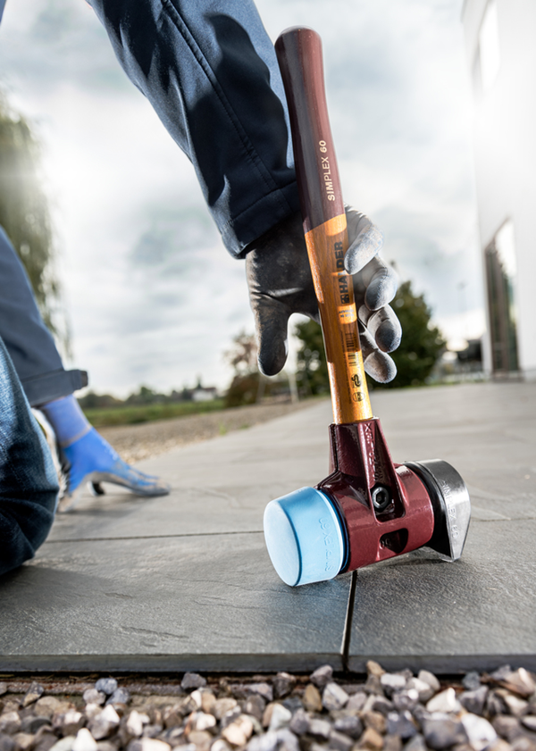 Wytrzymały młotek brukarski z serii SIMPLEX, wyposażony w dwie wymienne końcówki z czarnej, średniotwardej gumy. Zaprojektowany z myślą o codziennym użytku w pracach brukarskich, gdzie istotne jest tłumienie drgań, trwałość narzędzia i ochrona obrabianych powierzchni.