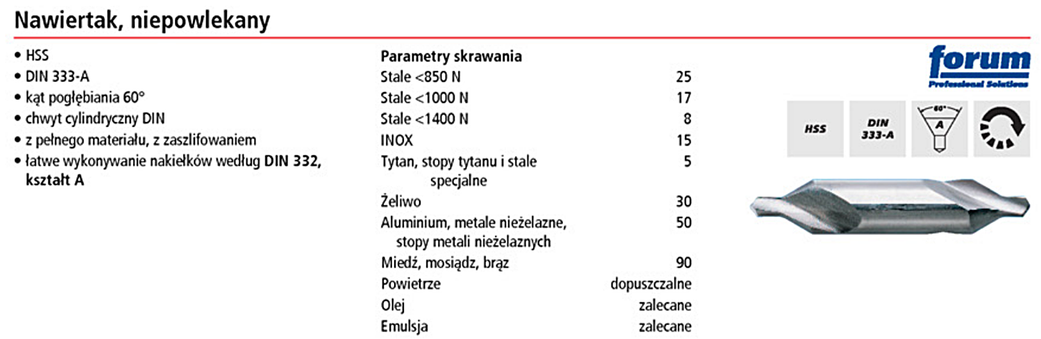 - łatwe wykonywanie nakiełków według DIN 332, kształt A