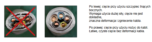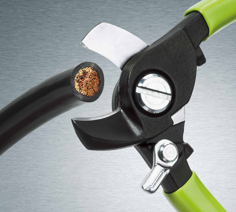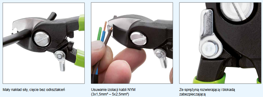 Nożyce do przecinania kabli ze specjalną geometrią cięcia, zapewniającą lekkie i precyzyjne cięcie, opcjonalnie ze sprężyną otwierającą· zgodne z normą żeglugi powietrznej AS6173/3· do kabli miedzianych powlekanych cyną, niklem i srebrem o wysokiej twardości i wytrzyma-łości stopu miedzi zgodnie ze specyfikacją AS22759, do stosowania również na kablach aluminiowych· nieodpowiednie do drutów i lin stalowych oraz drutów miedzianych ciągnionych na zimno· ergonomiczne załączanie jedną ręką· bez ryzyka zmiażdżenia czy odkształcenia kabla.