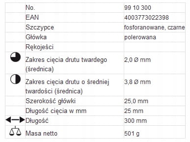 - Szczypce: główka polerowana, rękojeści fosforowane, czarne