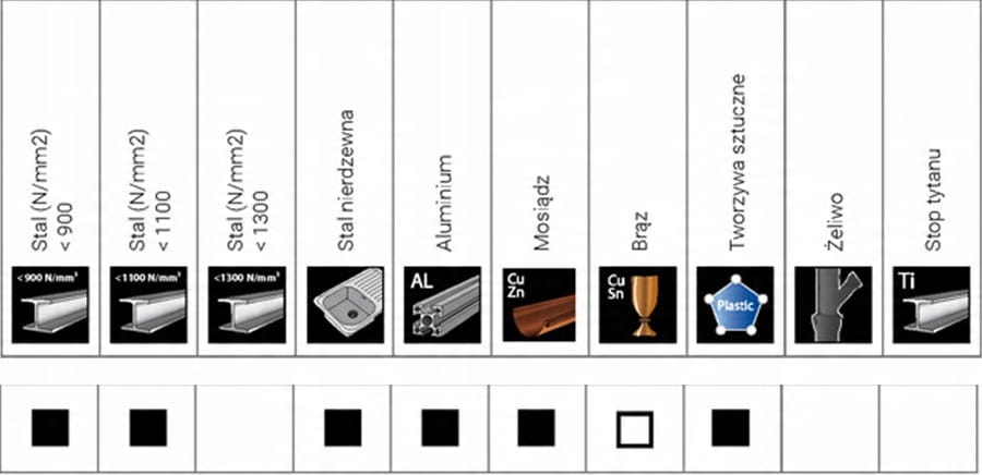 - Przydatne do stali zwykłych i stopowych (o wytrzymałości 1000 N/mm2), stali stopowych wysokochromowych jak np. VA, stali nierdzewnych i kwasoodpornych, metali kolorowych i lekkich.