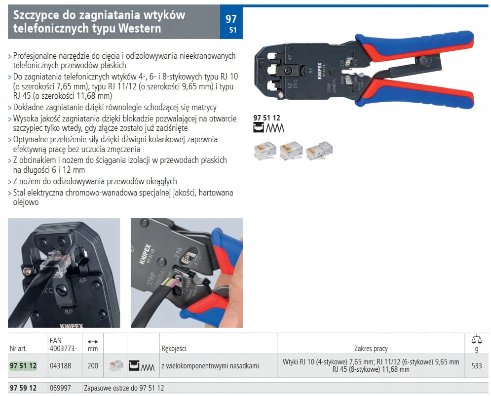 EAN 4003773043188 Szczypce do zagniatania wtyków telefonicznych 97 51 12 do zagniatania wtyków telefonicznych typu Western RJ45 RJ11/12 975112 Knipex