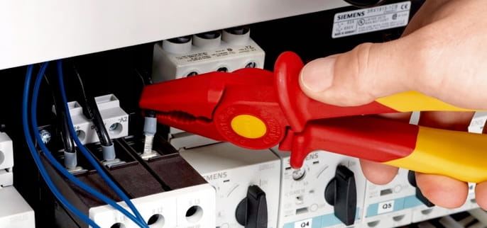 Wysokiej jakości, stabilne szczypce z izolacją z tworzywa sztucznego firmy KNIPEX zapewniają skuteczną ochronę podczas pracy przy obwodach pod napięciem do AC 1000V i DC 1500V.