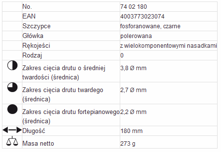 - Precyzyjne krawędzie tnące dodatkowo hartowane indukcyjnie (twardość krawędzi tnących ok. 64 HRC), do wszystkich rodzajów drutu, w tym drutu fortepianowego