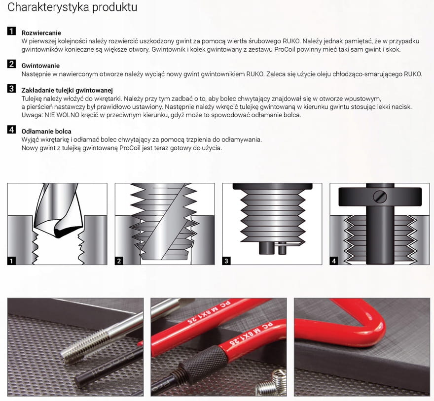 W pierwszej kolejności należy rozwiercić uszkodzony gwint za pomocą wiertła śrubowego RUKO. Należy jednak pamiętać, że w przypadku gwintowników konieczne są większe otwory. Gwintownik i kołek z zestawu ProCoil powinny mieć taki sam gwint i skok.
