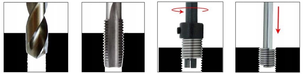 W pierwszej kolejności należy rozwiercić uszkodzony gwint za pomocą wiertła śrubowego RUKO. Należy jednak pamiętać, że w przypadku gwintowników konieczne są większe otwory. Gwintownik i kołek z zestawu ProCoil powinny mieć taki sam gwint i skok.