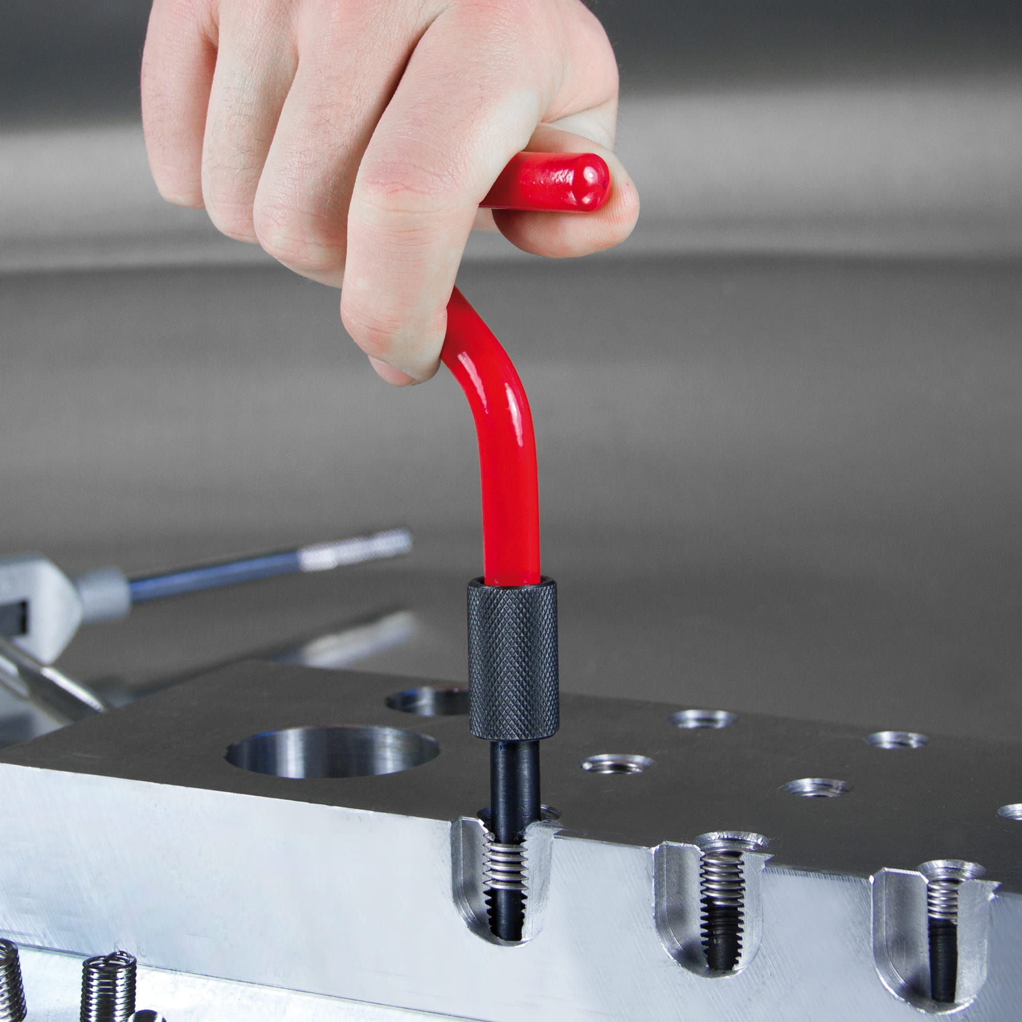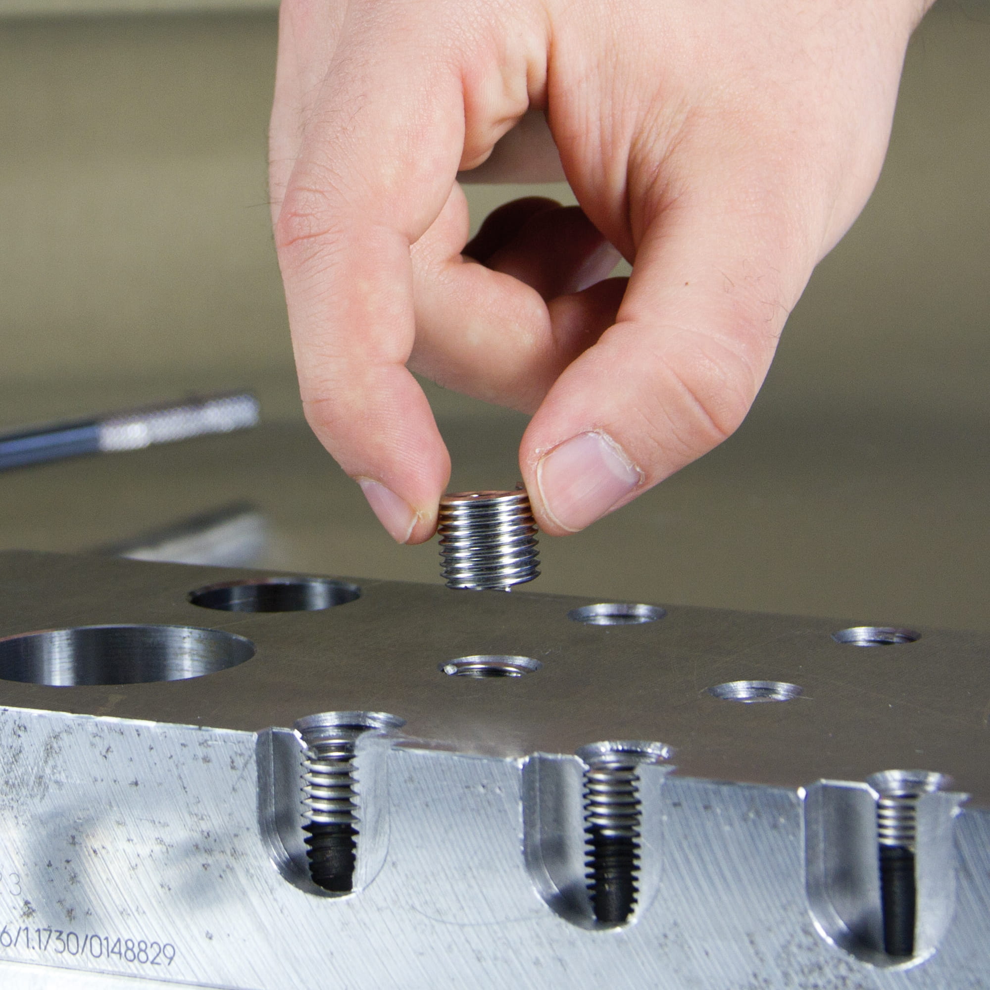 Wyjąć uchwyt wkręcający i odłamać bolec chwytający za pomocą trzpienia do odłamywania. Nowy gwint z tulejką gwintowaną ProCoil jest teraz gotowy do użycia.