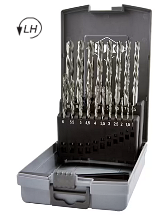 Zestaw 19 wierteł krętych LEWYCH DIN 338 typ N HSS-G szlifowanych, w kasecie z tworzywa sztucznego ABS