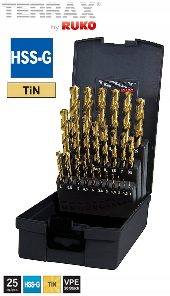 Terrax Zestaw 25 wierteł krętych DIN 338 typ N HSS-G TiN szlifowanych, w kasecie z tworzywa sztucznego ABS