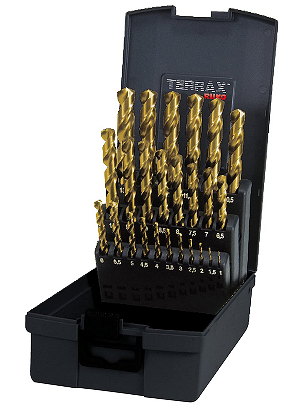 EAN 4007140367754 Wiertła do metalu tytanowe 1,0-13,0mm 25szt. HSS-G-TiN DIN338 powlekane TiN w kasecie z tworzywa sztucznego A250215TRO Terrax Ruko