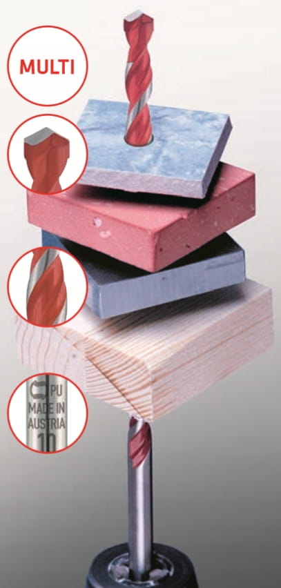 Wiertła PROFI MULTICUT pozwalają wiercić jednym wiertłem w różnorodnych materiałach takich jak drewno, sklejka, mur, tworzywa sztuczne, płytki ceramiczne, metale miękkie, stal.