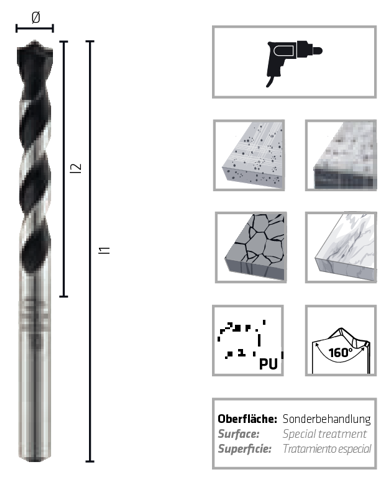 Wiertło przeznaczone jest do wiercenia udarowego w betonie, murze i kamieniu naturalnym oraz wiercenia bezudarowego w ceramice i marmurze.
