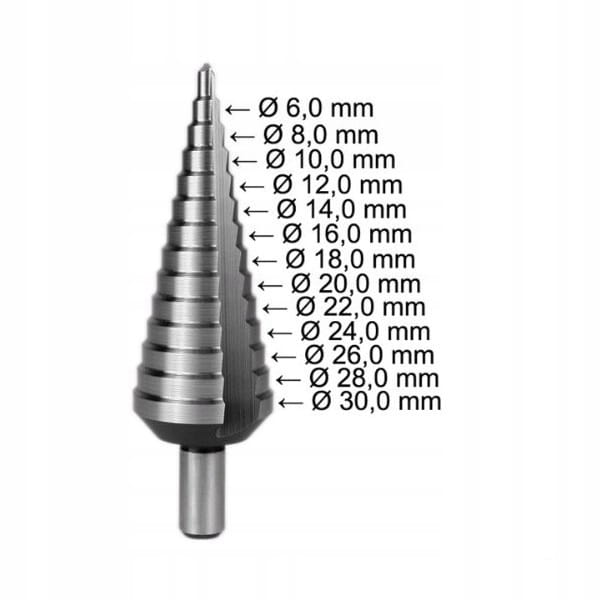 Wiertło stopniowe 6-30mm nr2 13 średnic (6,8,10,12,14,16,18,20,22,24,26,28,30) HSS-TiN