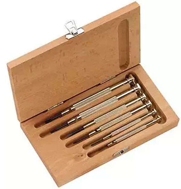 Zestaw wkrętaków zegarmistrzowskich w drewnianej kasecie, 6-cz.