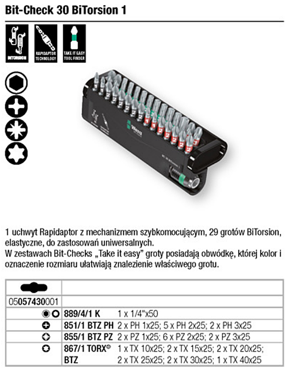 Elastyczne, do uniwersalnego zastosowania. Groty BiTorsion ze strefą skrętną absorbującą energię kinetyczną obciążeń szczytowych. Strefa BiTorsion eliminuje skręcanie wierzchołka grotu w przypadku występowania wysokich obciążeń, co dodatkowo zwiększa żywotność narzędzia. Stosowane z odpowiednim uchwytem osiągają najwyższą możliwą żywotność. Z technologią Rapidaptor pozwalającą na zamocowanie grotu bez konieczności przesuwania pierścienia przytrzymującego. Wymiana grotu następuje poprzez przesunięcie pierścienia przytrzymującego do przodu, co pozwala na szybką obsługę jedną ręką. Do grotów sześciokątnych 1/4" wg DIN ISO 1173-C 6,3 i końcówek E 6,3. Do mocowania we wkrętarce lub uchwycie wiertarki elektronicznej. Niewielka waga i duża kompaktowość zestawu w wielokomponentowej kasecie. Miękki materiał dolnej części kasety gwarantuje pewne mocowanie i łatwe wyjmowanie narzędzi. Szybkie rozpoznawanie profilu i wielkości dzięki systemowi wyszukiwania narzędzi "Take it easy" z identyfikacją kolorystyczną i dobrze widocznym oznaczeniem.