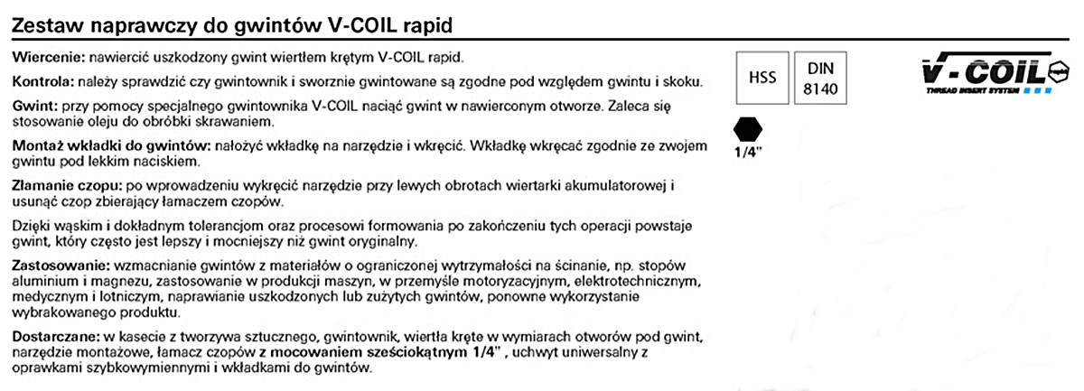 Gwint: przy pomocy specjalnego gwintownika V-COIL naciąć gwint w nawierconym otworze. Zaleca się stosowanie oleju do obróbki skrawaniem.