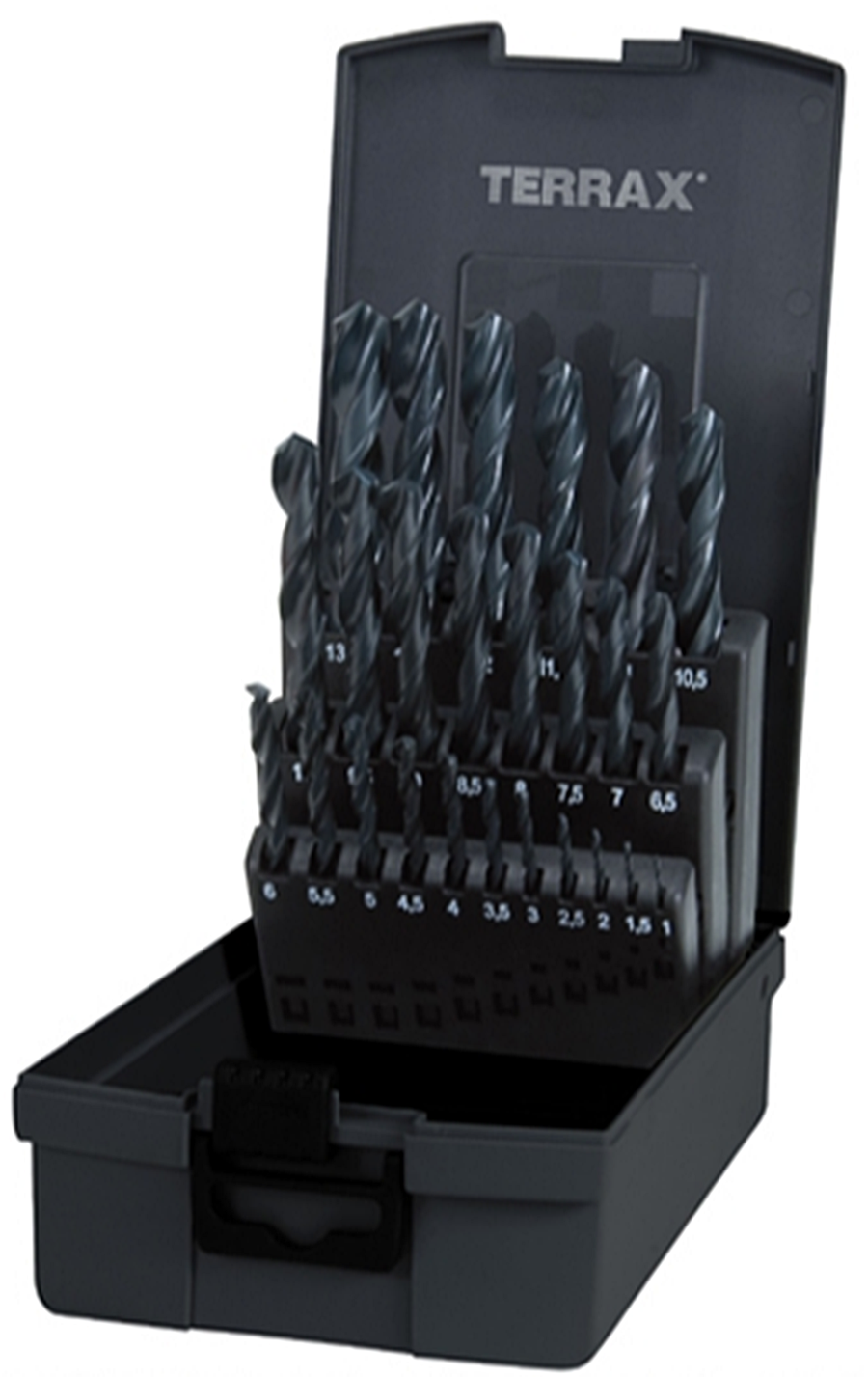 Terrax Zestaw 25 wierteł krętych DIN 338 typ N HSS-R, w kasecie z tworzywa sztucznego ABS