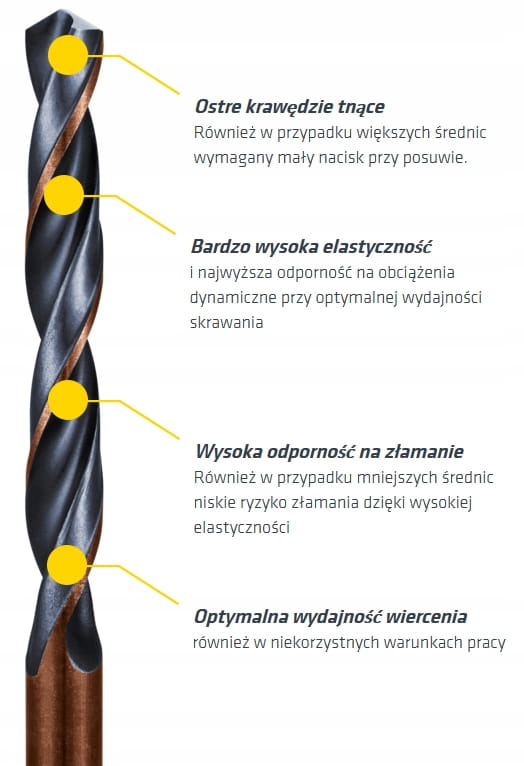- wiertła mają pogrubiony rdzeń przy uchwycie dzięki czemu wiertła te są bardzo elastyczne, odporne na pękanie podczas pracy,