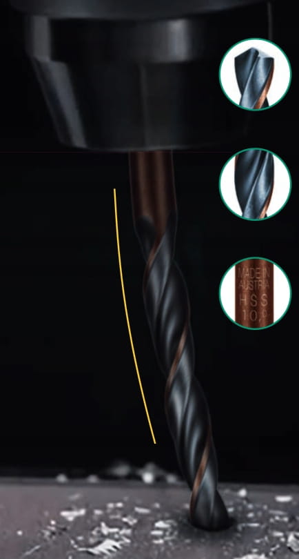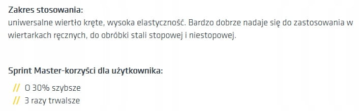 - dzięki specjalnej geometrii ostrza (wierzchołka) i krawędzi tnących oraz sposobowi hartowania części wiercącej wiertła z serii HSS Sprint MASTER cechują się dużą szybkością wiercenia (do 30% wyższą od tradycyjnych wierteł HSS) oraz 3-krotnie wyższą trwałością,