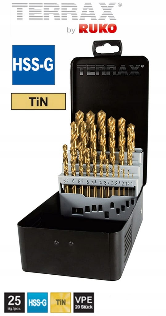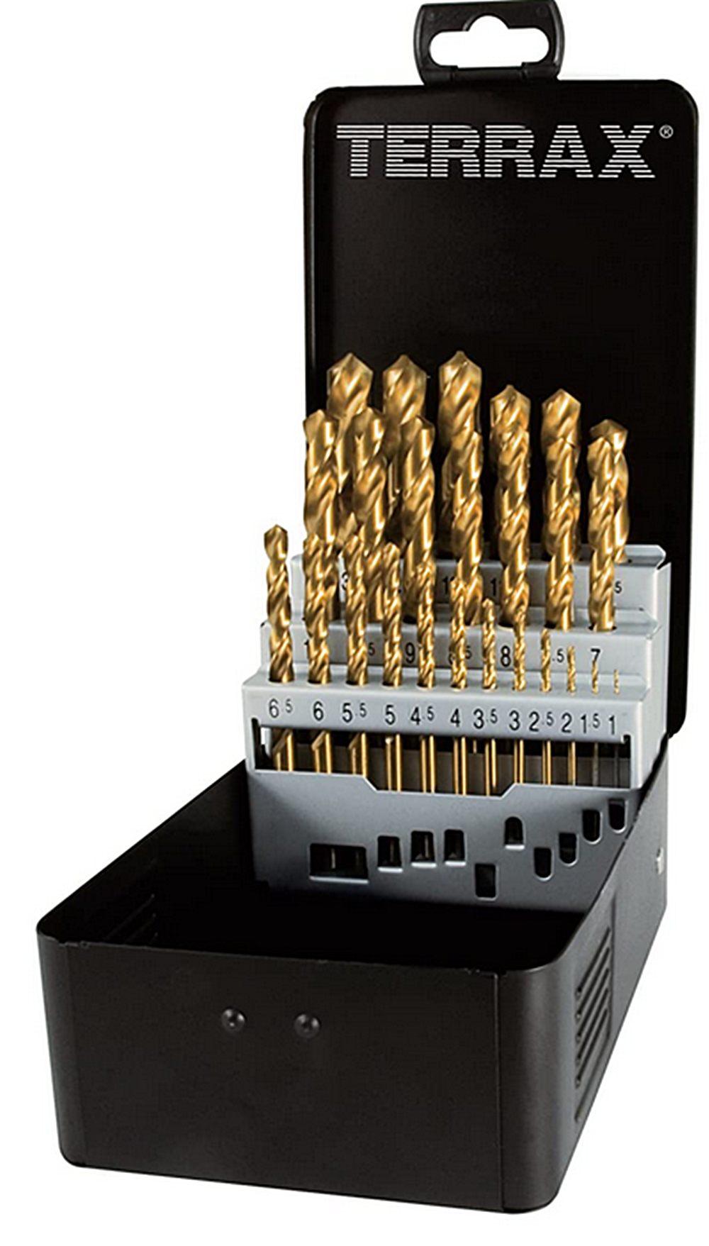 Terrax Zestaw 25 wierteł krętych DIN 338 typ N HSS-G TiN szlifowanych, w kasecie przemysłowej