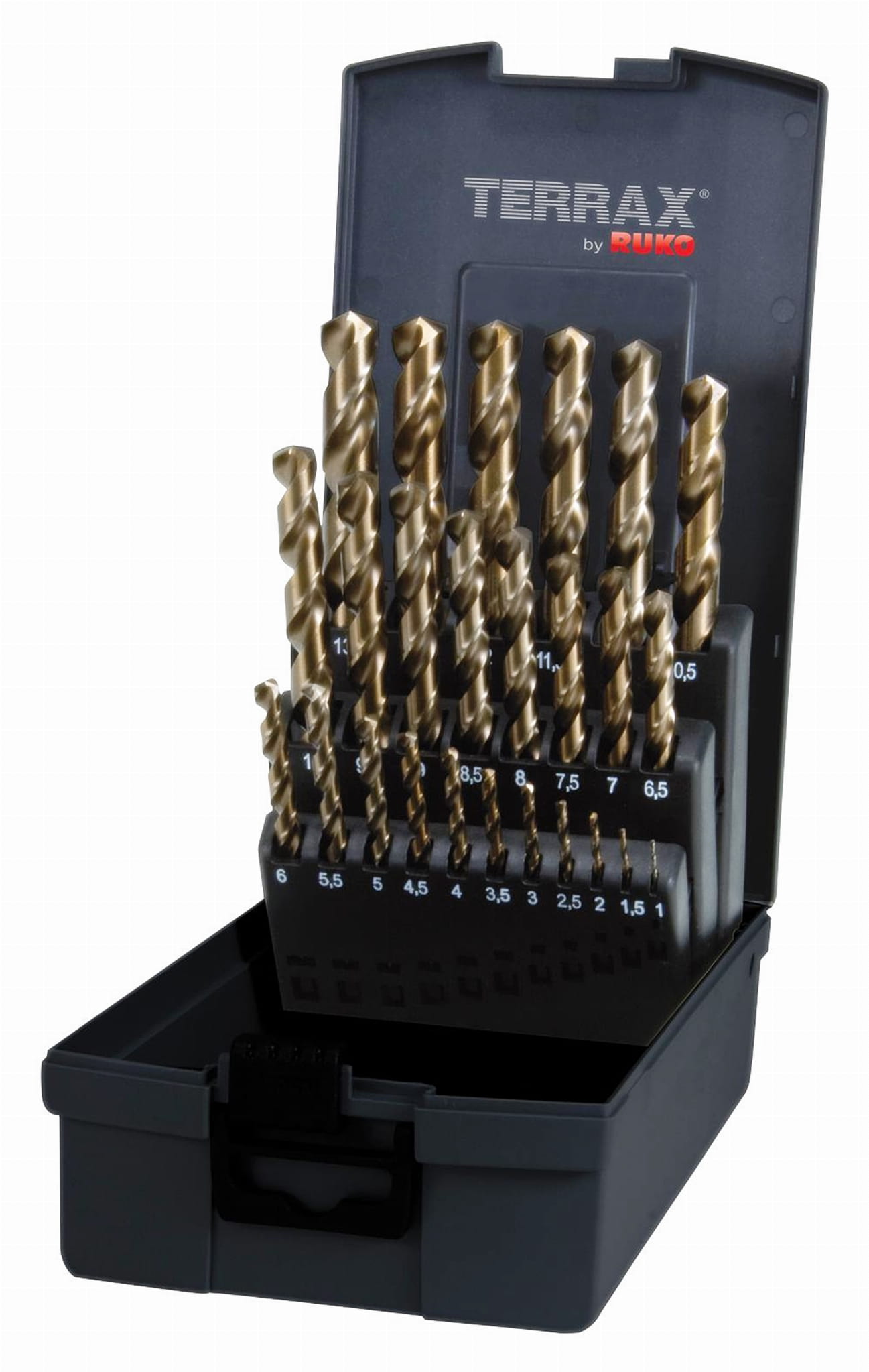 EAN 4007140367730 Zestaw wierteł kobaltowych do metalu 1,0-13,0x0,5mm HSSE-Co5 25szt. w kasecie z tworzywa sztucznego ABS DIN338 A215215RO Terrax Ruko